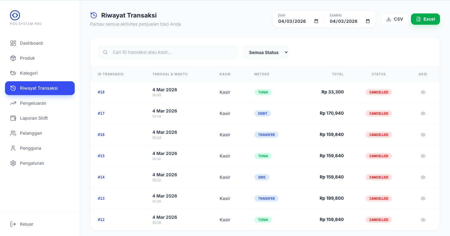 - Ekspor Data (Excel): Seluruh riwayat transaksi, laporan shift, dan pengeluaran bisa diunduh ke format Excel (.xlsx) untuk keperluan akuntansi.
