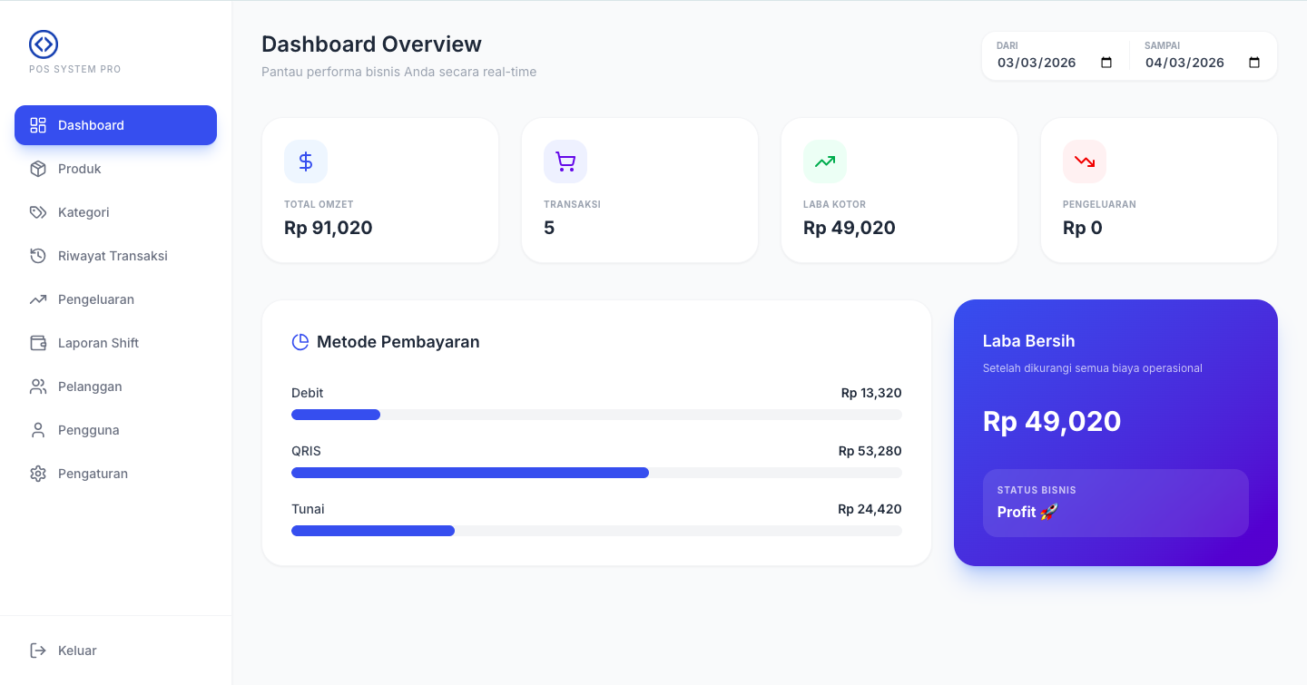 - Keamanan Shift: Kasir wajib menginput "Modal Awal" dan "Uang Fisik" saat tutup shift untuk mencegah kecurangan.